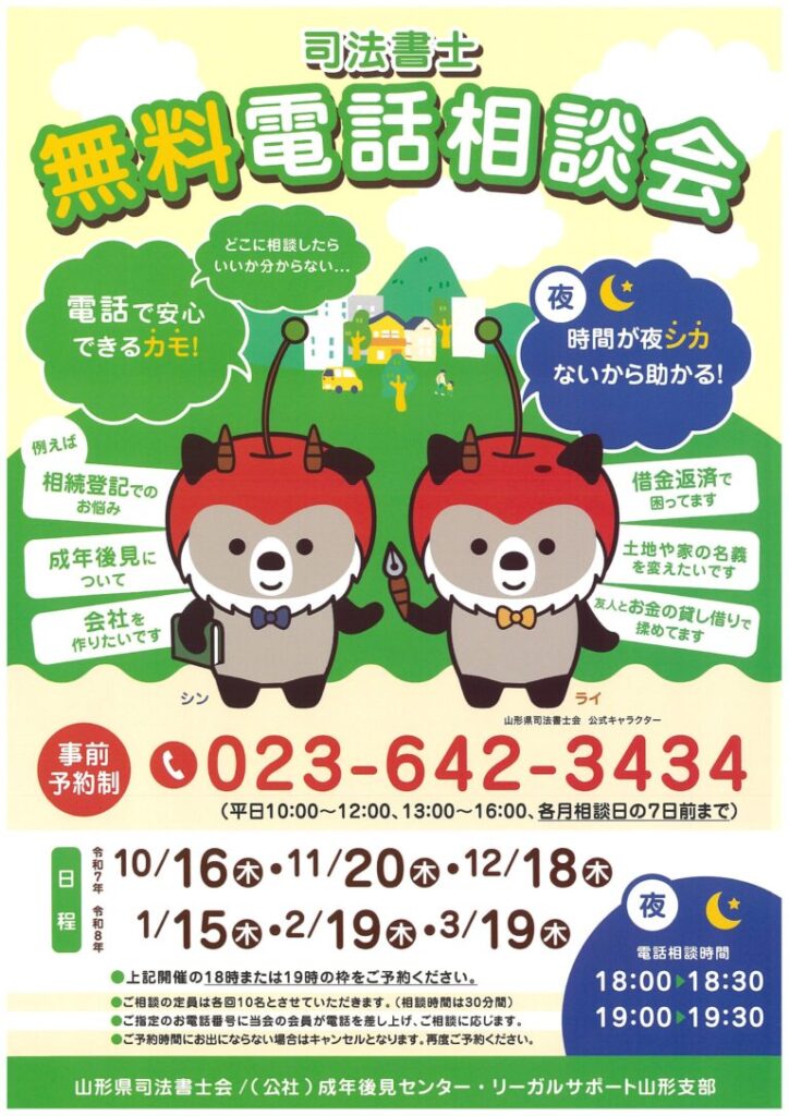 | お問い合わせ | 山形県司法書士会 TEL:023-642-3434 |