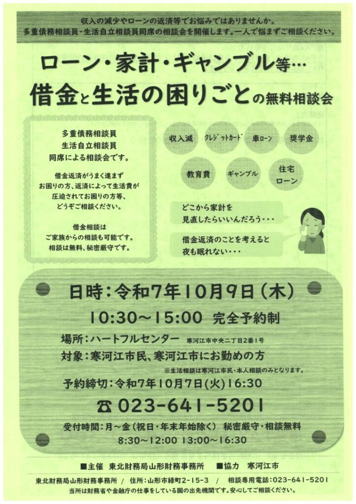 2025年 10月 9日(木曜日) 10:30~ 借金と生活の困り事の無料相談会(完全予約制) 会場:ハートフルセンター(寒河江市中央二丁目2番1号) 主催:東北財務局 山形財務事務所 【協力】寒河江市 ■チラシダウンロード [連絡先] 東北財務局 山形財務事務所 相談専用電話:023-641-5201