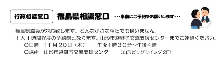 2025年 11月 20日(木曜日) 13:30~ 福島県相談窓口 会場:山形市避難者交流支援センター(山形国際交流プラザ ビッグウィング2階) [連絡先] 山形市避難者交流支援センター TEL:080-2807-7591