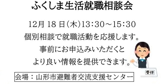 2025年 12月 18日(木曜日) 13:30~ ふくしま生活就職相談会 会場:山形市避難者交流支援センター(山形国際交流プラザ ビッグウィング2階) [連絡先] 山形市避難者交流支援センター TEL:080-2807-759