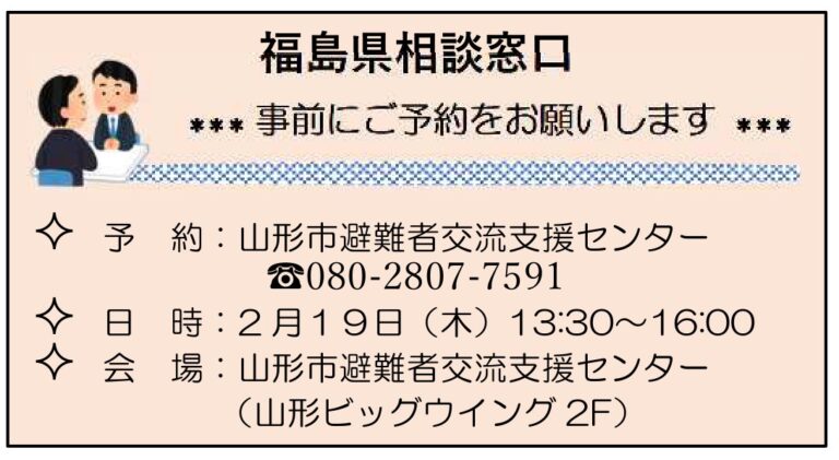 2026年 2月 19日(木曜日) 13:30~ 福島県相談窓口 会場:山形市避難者交流支援センター(山形国際交流プラザ ビッグウィング2階) 福島県職員が対応いたしますので、お気軽にお越しください。 どんな小さな事でも構いません。 1人1時間程度の予約制となります。 [連絡先] 山形市避難者交流支援センター TEL:080-2807-7591