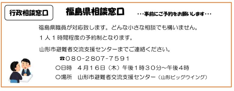 2026年 4月 16日(木曜日) 13:30~ 福島県相談窓口 会場:山形市避難者交流支援センター(山形国際交流プラザ ビッグウィング2階) 福島県職員が対応いたしますので、お気軽にお越しください。 どんな小さな事でも構いません。 1人1時間程度の予約制となります。 [連絡先] 山形市避難者交流支援センター TEL:080-2807-7591