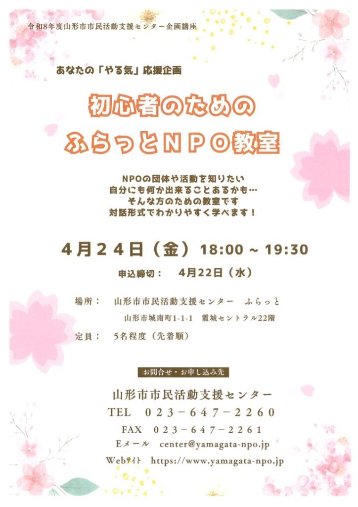 2026年 4月 24日(金曜日) 18:00~ 初心者のためのふらっとNPO教室 会場:山形市市民活動支援センター(霞城セントラル22階) 添付ファイル チラシ 申込書 [連絡先] 山形市市民活動支援センター TEL:023-647-2260