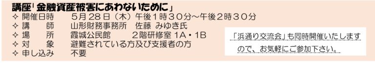 2026年 5月 28日(木曜日) 13:30~ 講座「金融資産被害にあわないために」 会場:霞城公民館 2階 研修室(1A・1B) 今年も様々な金融被害の事件が多発しています。 自分事として、しっかり知識を身につけて、ご自身の大切な資産を守りましょう。 [連絡先] 山形市避難者交流支援センター TEL:080-2807-7591