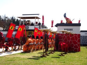 人間将棋は昭和31年から始まる伝統行事で、今年で69回目。鎧や甲冑を纏った駒役が武将の指示で戦いを繰り広げる光景は、人間絵巻を見ているような美しさです。