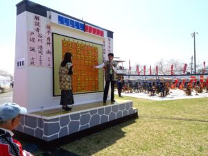 天童市の舞鶴山山頂にて、春の恒例イベント「人間将棋」が4月13日(土)と14日(日)2日間の日程で開催され、県内外から大勢のファンが集まりました。天童市では桜の季節に合わせ桜まつりも同時開催。倉津川沿いのしだれ桜のライトアップも行われました。舞鶴山では約2千本の桜が見頃となり、お花見を楽しむご家族連れの姿が大勢見られました。山道の入り口には、2017年に震災復興を祈念して植樹された「希望の桜」も立派に成長し、満開の桜が咲き誇っていました。