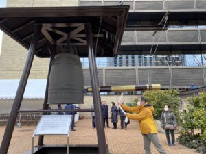 山形市役所前で黙とうが捧げられ、復興と平和を願い打鐘が行われました。