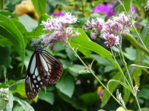 自然な雰囲気を大切にしたイングリッシュガーデンが広がり、今の時期にはダリアをはじめ、秋明菊や藤袴など色鮮やかに蔵王の雄大な山々と共に楽しむことができます。足元には可憐な花や珍しい野生のシクラメンも見られ、様々な実も庭に彩りを添えています。また、野鳥や蝶が花の蜜を求めて集まり、長距離を異動することで有名なアサギマダラもやってきました。