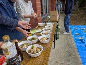 中庭にはプロパンガスとコンロが搬入され、面倒な火起こしもなく火力も十分でした。食材はみんなで包丁を握って下準備。火の通りにくい里芋、大根を茹で、柔らかくなったら醤油・酒・砂糖を目分量で入れ、ベテラン勢に味の調整をしてもらい、牛肉・しめじなどを投入し、最後にネギを加えて出来上がり。