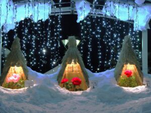 高畠町では毎年、冬の時期にわらの屋根に守られた色鮮やかな牡丹をご覧いただけます。夕方からはライトアップされた幻想的な景色も是非お楽しみください。
