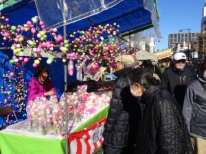この時期は最も寒く雪が多い時期ですが、今年は澄み切った晴天に恵まれ、縁起物の団子木やだるま、初飴、木工製品の他、県内のグルメや宮城県石巻市からワカメなどの海産物も並び、多くの人で賑わいました。