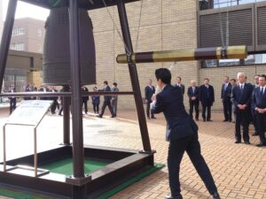 市役所内で黙とうが捧げられ、これからも支援の輪が広がることを願って「千年和鐘」の打鐘が行われました。