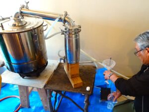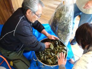 午前の部は株式会社「白い森林の精」の本間さんを講師に迎え、日本固有の香木「クロモジ」の精油蒸留体験が行われました。抗菌・殺菌・消臭効果があると言われており、中でも群生地が多い小国町産は香りの成分が特別なのだそうです。今回は2キロの乾燥葉から水蒸気蒸留法で精油とハーブウォーター(芳香蒸留水)を抽出。はみ出んばかりの量の葉を釜に詰め込み、蒸気で蒸し上げると徐々に爽やかな香りとともに香り成分を含んだ蒸留水が流れ出てくる仕組みです。表面にうっすらと精油が見えると参加者からは感嘆の声が。採れた精油はわずか4ml。慎重にスポイトですくい上げる手元には緊張感が漂いつつも、フレッシュな香りに包まれ、皆さんの表情が自然と和みました。