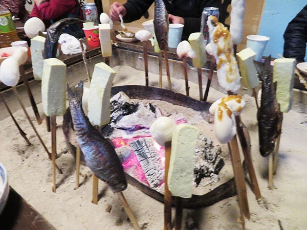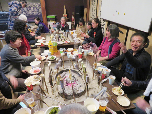 有機味噌仕込みと田楽つくりの集い 農家に泊まった客を「半殺し」でもてなそうとする老夫婦の会話を耳にし、客が夜通し眠れなかったという「日本むかし話」の話題も出るなど、囲炉裏の周りは大賑わい。遠方からの参加には、山形の方言での説明や会話に戸惑いつつも、笑いの絶えない集いとなりました。
